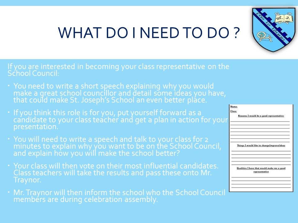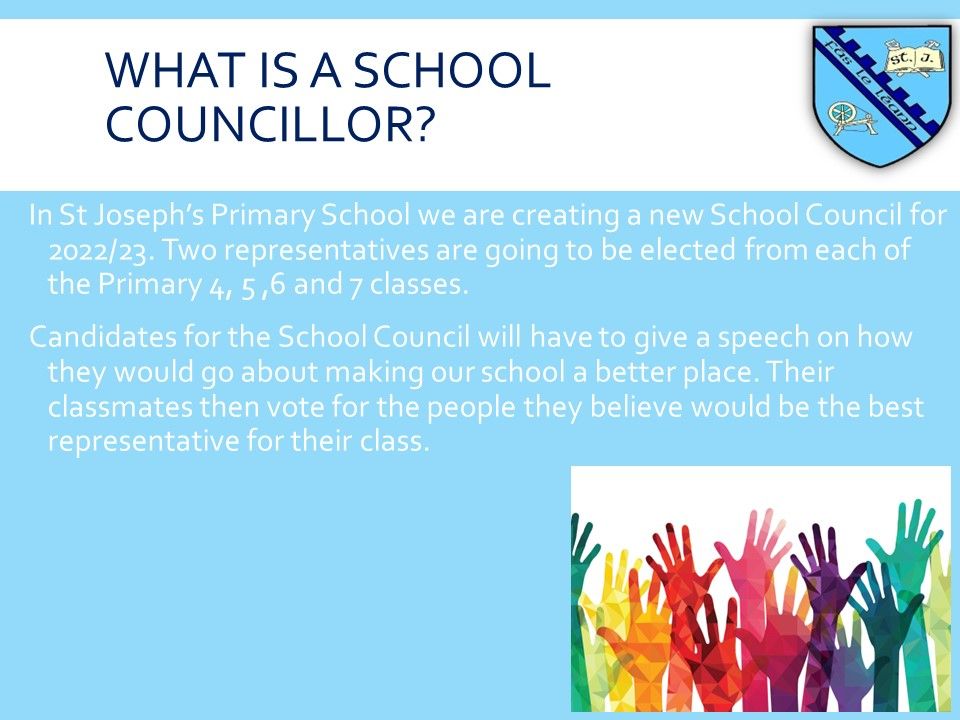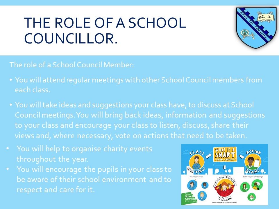 As members of the School Council 2024-2025, our aim is to work with the school staff, pupils and wider community to make our school more fun and interesting. We aim to help local charities and fundraise for school funds. We are the leaders of the school and continue to make improvements in St. Joseph's.